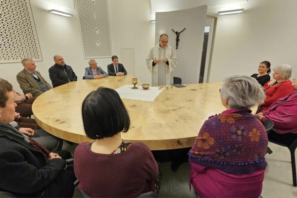 Základem kaple je kruhový stůl, který shromažďuje účastníky bohoslužebných setkání. Tento kruh je však na jedné straně nedokončený, rozlomený. Narušení, které zpřítomňuje mimo jiné nedokonalost a neúplnost každého lidského společenství, každé lidské rodiny, symbolicky zaceluje korpus ukřižovaného Krista na bílé stéle. Dvě velká okna vyplněná ornamentálním vzorem na prvními deseti písmeny, která jsou zároveň číslicemi hebrejské abecedy, odkazují na desky Desatera.