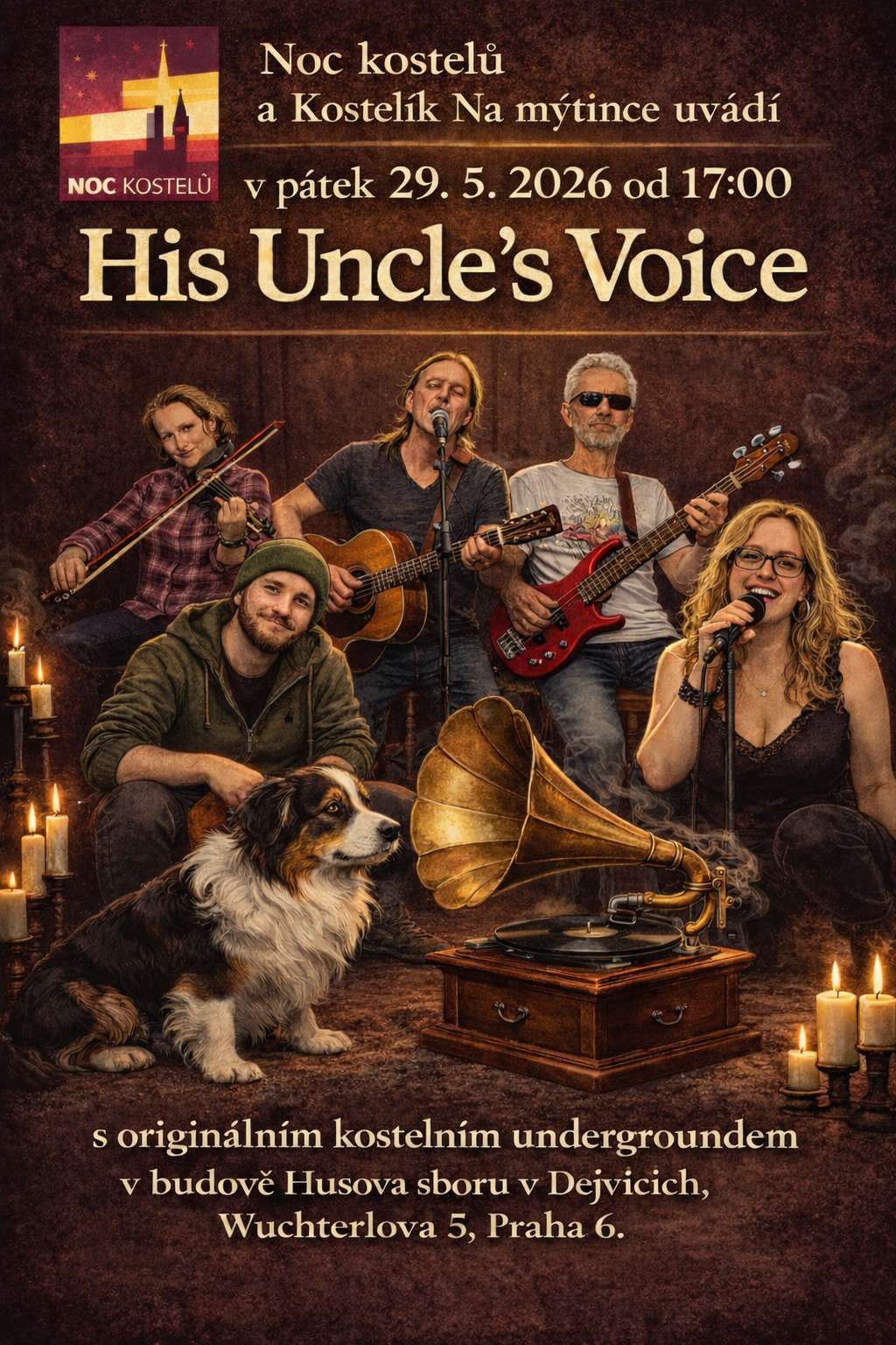 Noc kostelů a Kostelík Na mýtince uvádí v pátek 29. 5. 2026 od 17:00 His Uncle´s Voice s originálním kostelním undergroundem v budově Husova sboru v Dejvicích, Wuchterlova 5, Praha 6 |
