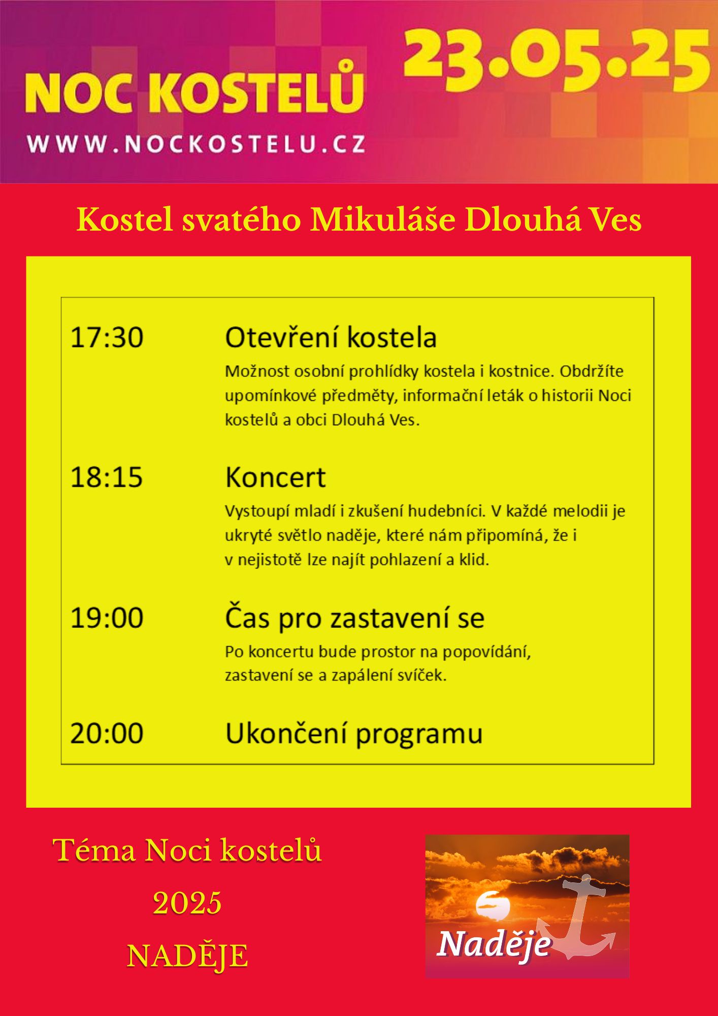 U příležitosti Noci kostelů proběhne koncert, vystoupí především dlouhoveské děti a mládež. Téma Noci kostelů v roce 2025 je naděje. V každé melodii je ukryté světlo naděje, které nám připomíná, že i v nejistotě lze najít pohlazení a klid.