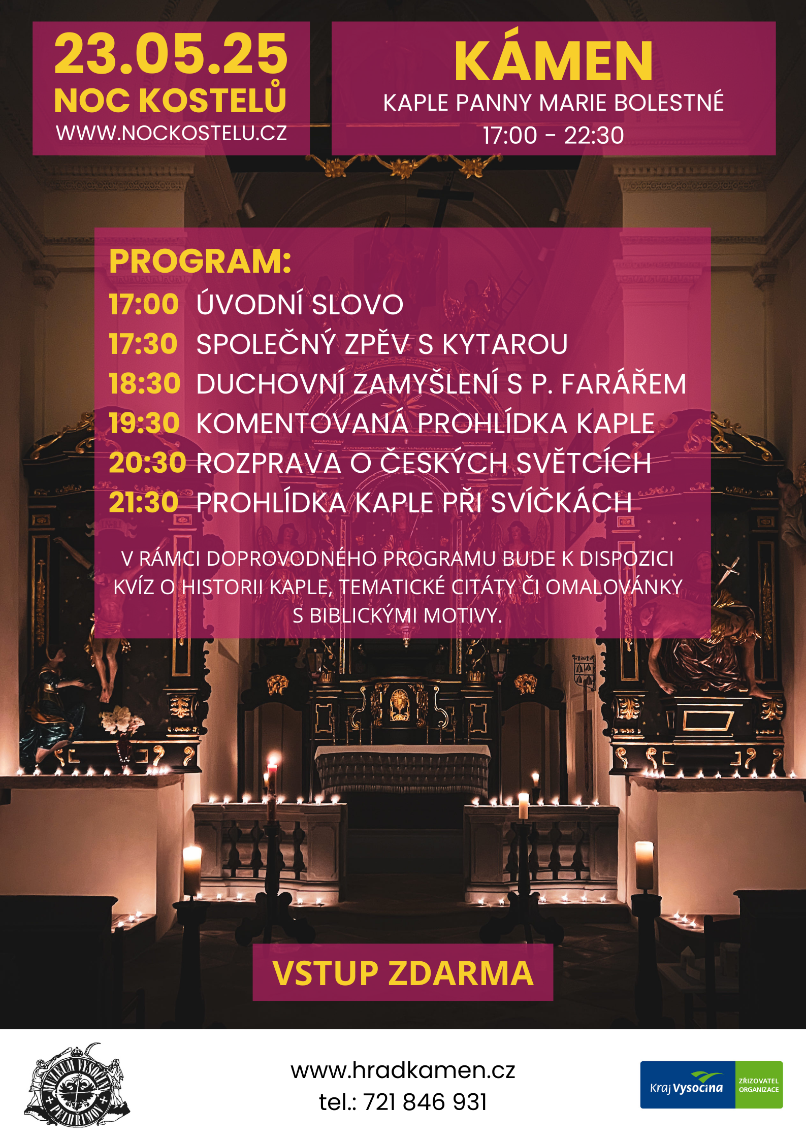 Od 17:00 do 22:30 hodin vás čeká nevšední program pro malé i velké - komentované prohlídky, duchovní zamyšlení s panem farářem i společný zpěv za doprovodu kytary. Vrcholem večera bude prohlídka kaple při svíčkách, která nabídne jedinečnou atmosféru a klid k rozjímání. Pro děti i dospělé budou připraveny doprovodné aktivity, jako kvíz o historii kaple, omalovánky s biblickými motivy a tematické citáty k zamyšlení. Akce se koná zdarma. Tato noc není jen o prohlídce sakrálního prostoru, ale také o zastavení se v ruchu všedních dní a možnosti načerpat inspiraci v tichu a kráse unikátní památky. Přijďte nasát atmosféru místa, které spojuje historii, víru a lidské příběhy. Těšíme se na milá setkání v Kámeně!