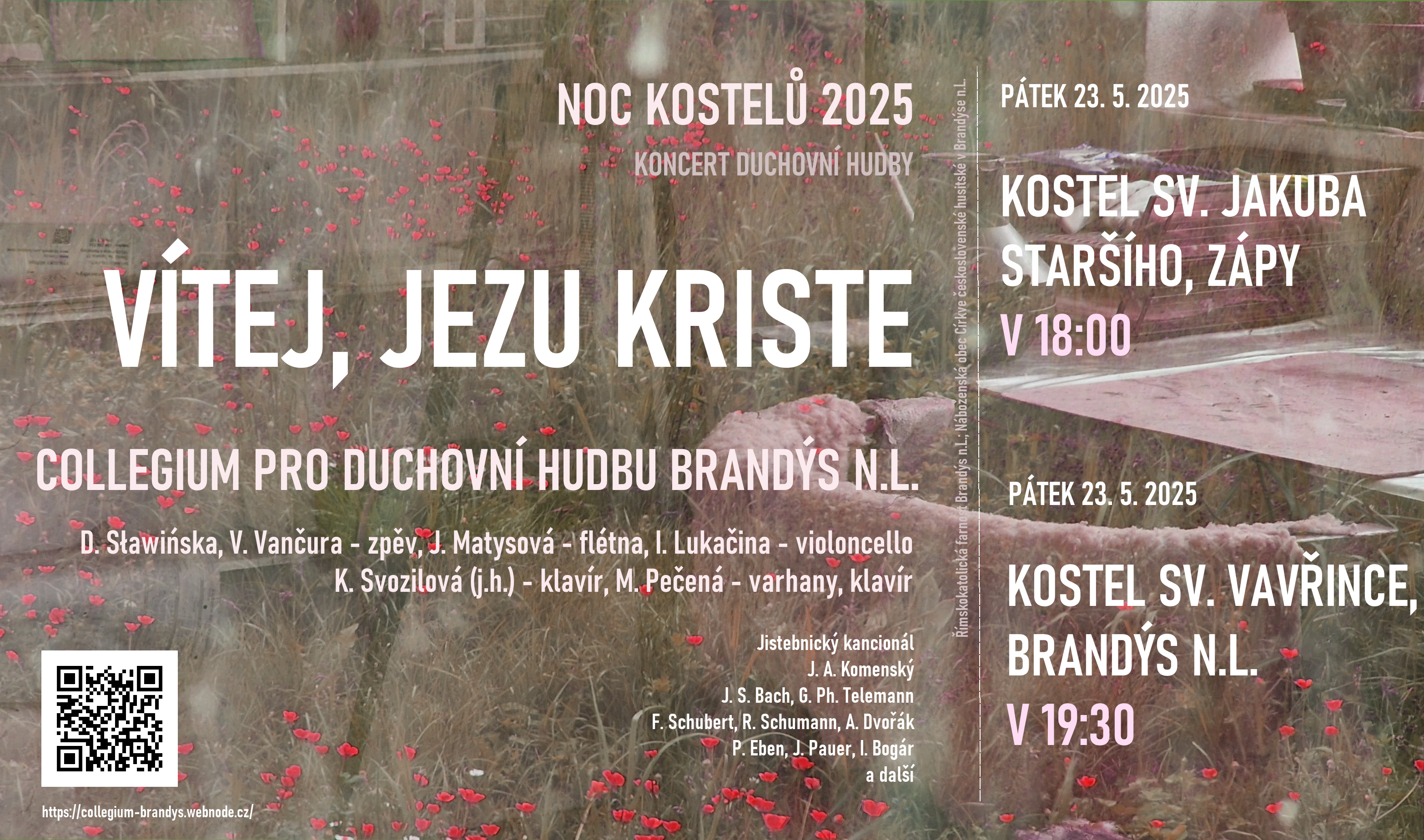 V kostele vystoupí Collegium pro duchovní hudbu Brandýs n. L. (D. Slawińska, V. Vančura - zpěv, J. Matysová - flétna, I. Lukačina - violoncello, K. Svozilová - klavír, M. Pečená - varhany, klavír)